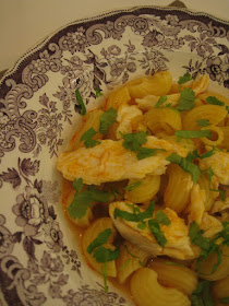 Picar uma cebolinha e dois dentes de alho e refogar no azeite. Quando estiver bem puxadinho, acrescentar o molho de tomate (umas 4 colheres de sopa) e a massa de pimentão e mexer bem. Adicionar a água ou o caldo de cozer peixe e temperar de sal. Quando ferver, colocar a massa e reduzir a temperatura. Deixar cozer de acordo com as indicações da embalagem. Uns minutinhos antes de terminar a cozedura, acrescentar as lascas de peixe. Servir de imediato, polvilhado com coentros picados.